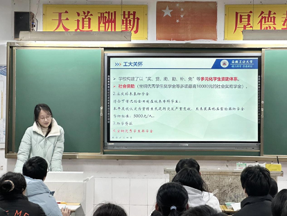 学院“学生资助宣传大使”返回家乡,深入中学,利用寒假赴高中现身说法,开展“资助政策下乡”行动。她们结合自身经历,向学弟学妹及家长详细介绍学校奖、助、贷、补、勤、免等资助体系,分享大学生活感悟与学习经验,鼓励家庭经济困难学生树立信心、积极报考,为高校与生源地搭建起政策传递的暖心纽带。