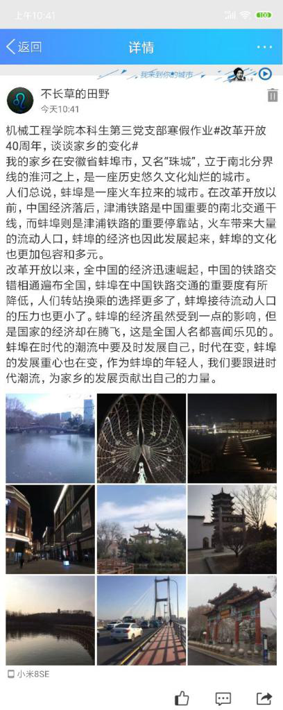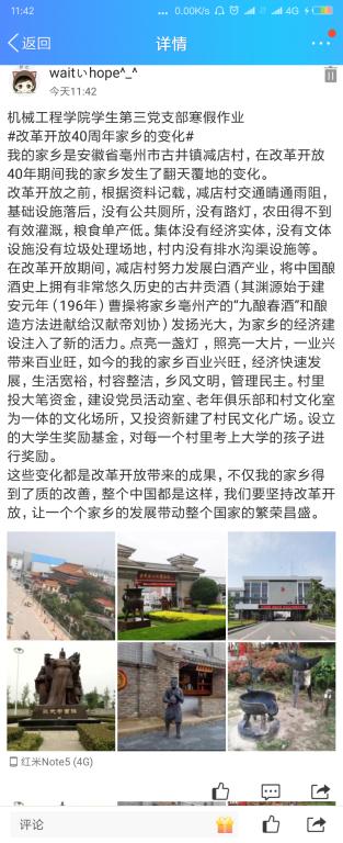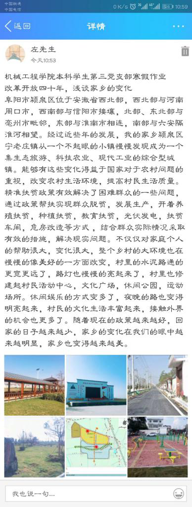 为了增强我支部党员的政治意识,提升学生党员的爱国情感和爱“家”情怀,以改革开放40周年为契机,学生党员用自己所看、所想记录自己周边改革开放40周年的巨大变化。为此,党支部给每位党员布置了寒假作业——改革开放40周年,谈谈我的家乡的变化。