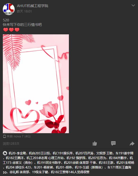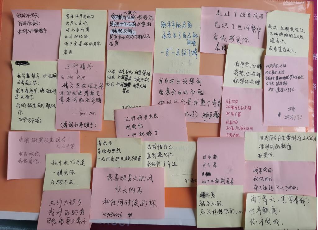 要求以“情”入诗,三行为限,主题任选,友情、爱情、亲情、爱国情均可。学院前期通过官Q、QQ群等渠道推送活动通知,鼓励同学们广泛参与,手写、打印、电子版提交作品均可。最终8位同学的作品脱颖而出,被评为最佳“三行情书”。