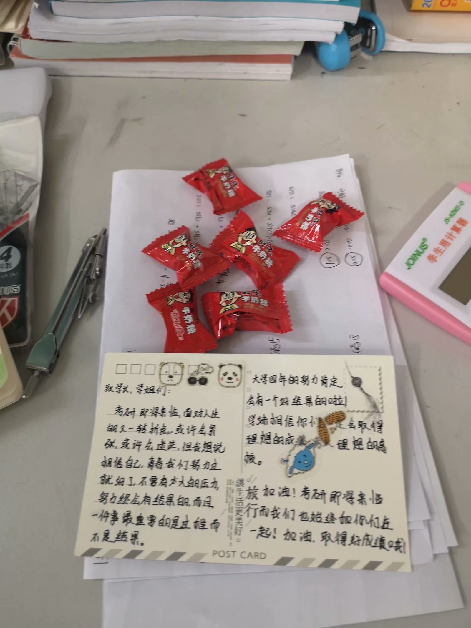 研究生入学考试倒计时3天了,机械楼四楼考研自习室弥漫着紧张的备考氛围,大家都在争分夺秒。为了给学长学姐加油打气,19级新生用亲手书写“加油卡”为考研学生助力,12月18日上午,他们走进机械楼四楼考研自习室,亲手把“加油卡”递给大四学长学姐。