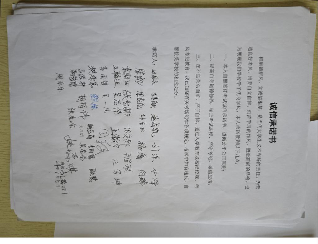 辅导员带领同学们学习了《中华人民共和国教育法》、《国家教育考试违规处理办法》等法律法规,介绍了学校关于严肃考风考纪的各项政策,倡导同学们遵守考风考纪,合理规划时间,认真复习,诚信考试。紧接着,通过列举考试作弊的相关案例对同学们进行了警示教育,提高同学们对诚信考试的认识,并强调考试是对心理状态的一次磨炼,大家要调整好自身状态,加强心理建设。最后,辅导员组织各位同学阅读并签署了《诚信考试承诺书》,同学们纷纷表示将积极备考、诚信应考,严守考风考纪,以实际行动营造公平公正考试氛围。(撰稿:张敏;  审核:濮莹萍;周环;陈庆林