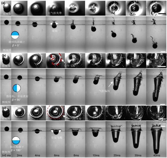 此外,团队针对表面微观形貌对液膜飞溅的影响机制是固-液界面减阻气腔构筑机制中的关键科学问题,开展了考虑表面形貌效应的球体入水动力学特性研究,分析了微结构面积占有率不同的球体垂直入水多相流动过程,并从能量角度揭示了非对称入水气腔偏转机制。形成的入水气腔能够将表面无滑移边界条件转变成气液界面自由滑移边界条件,显著降低流体阻力。通过调控表面形貌产生的非对称入水气腔为跨介质航行器入水提供了一种新的策略。相关工作发表在《中国科学:物理学 力学 天文学》,竞彩足球