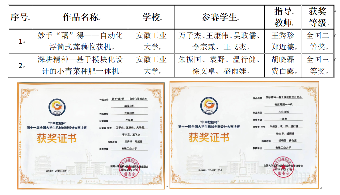 万子杰等人的《妙手“藕”得——自动化浮筒式莲藕收获机》(指导教师:王秀珍、郑近德)荣获国赛二等奖,朱振国等人的《深耕精种-基于模块化设计的小青菜种肥一体机》(指导教师:胡晓磊、费白露)荣获国赛三等奖。此外,本次竞赛另有2件作品获得安徽省赛一等奖,4件作品获得安徽省赛二等奖,5件作品获得安徽省赛三等奖。