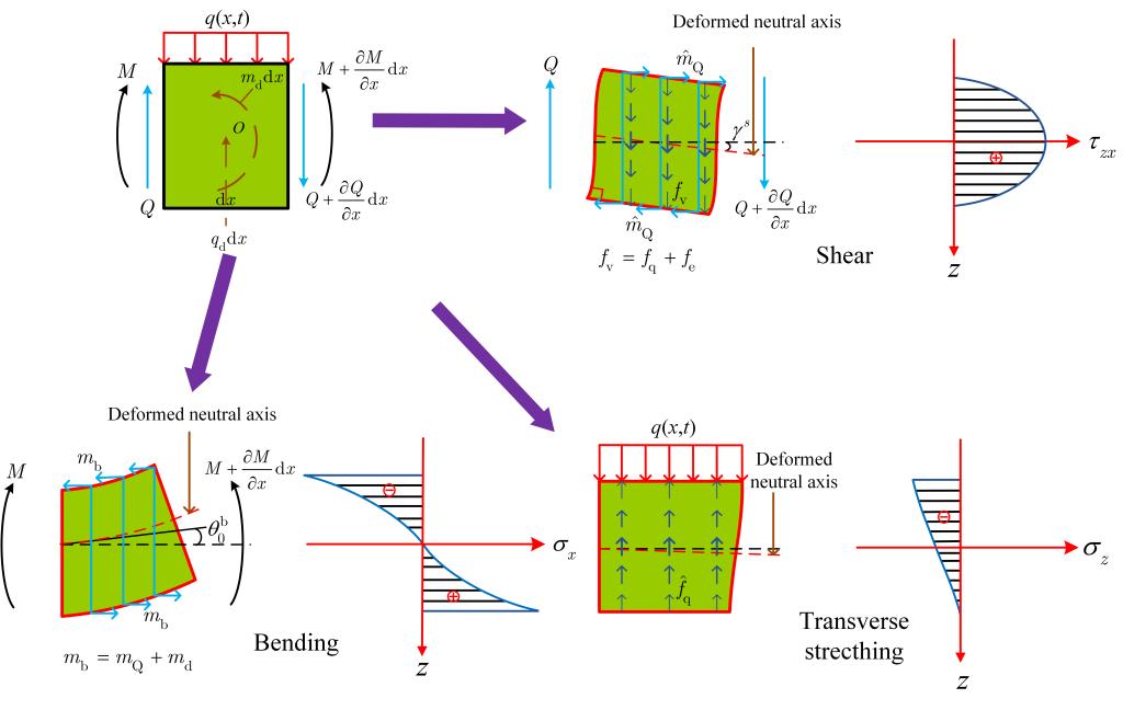 此外,为准确预测平面深梁的振动、弯曲和屈曲响应,本研究采用变形分解方法,提出了一种精确、高效而通用的高阶剪切变形梁理论。该理论基于弹性力学,将梁的变形分解为弯曲、剪切和挤压三个相对独立的部分进行精确分析,并根据不同变形间的内在联系(平衡关系)避免了额外变量的引入,针对平面梁的静力、振动和屈曲问题获得了高精度的响应结果。物理意义清晰、计算方便高效、响应预测精准,可进一步应用于非均质材料、多场耦合、强非线性等复杂梁问题。相关研究成果发表在《Engineering Structures》,论文与浙江大学合作完成,竞彩足球