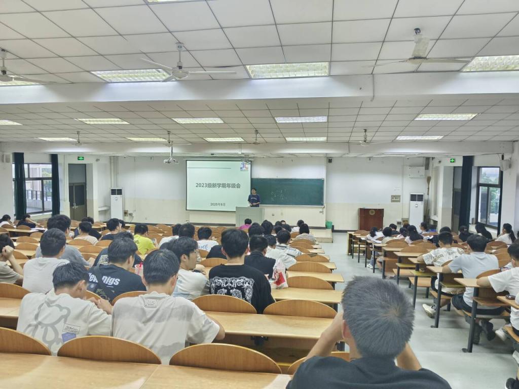 2023级于东教一阶201、东教一阶202教室召开新学期年级会,围绕学生手册、安全教育、晚考勤制度及防范电信诈骗等多项内容展开,旨在进一步加强学生管理,增强学生安全意识。