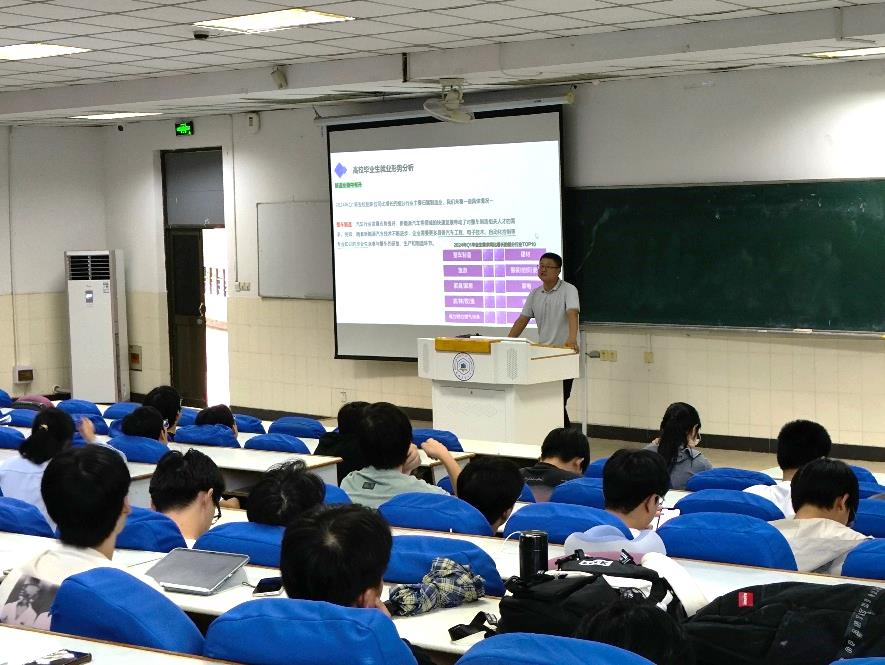去年毕业生的就业数据进行了具体说明。接着,他建议同学们从思想、知识和能力三方面着手,尽早树立职业规划意识,明确个人职业目标,做好充分的就业准备。在简历制作方面,他详细讲解了简历的基本构成、排版技巧以及如何有效展现个人优势。最后,针对有考研、考公或创业意向的同学,他强调应结合自身实际情况科学规划,避免盲目跟风,同时要坚定信心,保持积极良好的心态迎接未来的挑战。