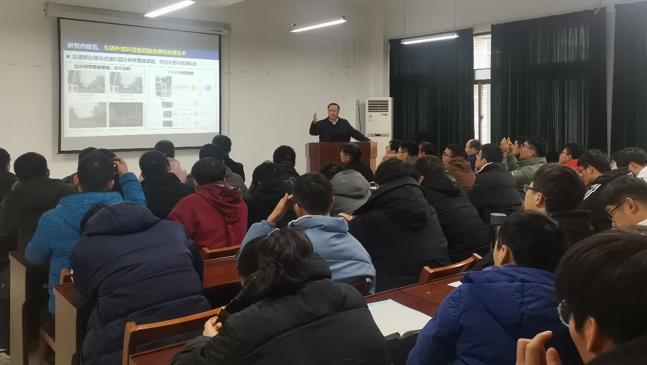 在题为“汽车智能化电动底盘设计理论、方法与控制研究”的报告中,以“现有车辆的研发设计体系已无法满足汽车智能化和网联化的发展要求”为交流背景,围绕底盘随动重构、信息增强感知、智能协调控制等方面进行了讲述。殷国栋教授从自身经验和团队工作中总结出若干体会,就智能电动车辆环境感知技术中的主流感知方案与特点、多传感器融合感知存在的问题、底盘多智能体动态协调控制系统、全线控智能电动底盘动态协调控制策略、分布式电驱动乘用车底盘及整车控制系统设计等内容做了详细且生动的讲解,为学院师生提供了合作交流平台。通过殷国栋教授深入浅出的讲解,使老师和同学们对电动汽车感知及控制融合验证平台的搭建、车辆外部环境智能融合感知关键技术及现有技术难点等有了比较深刻的了解。