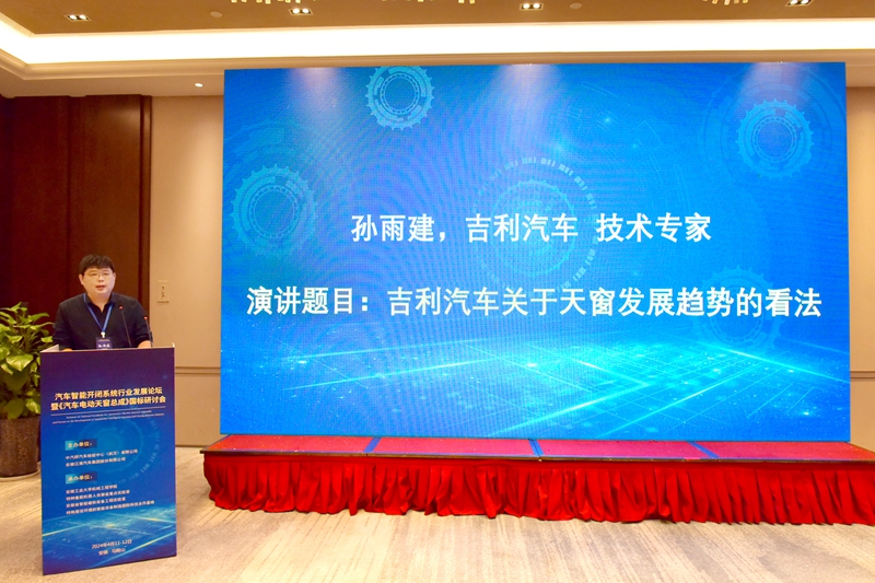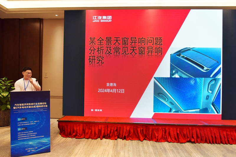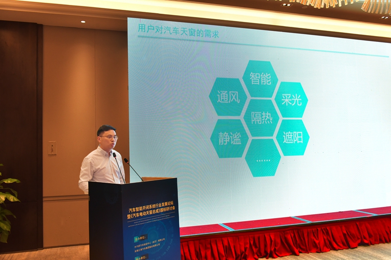 专题报告环节,蔚来汽车总监蒋超、江淮汽车主任工程师袁德海、吉利汽车技术专家孙雨建、伟巴斯特研发总监胡和健、上海拓殷总经理韦青、京东方晟视科技销售副总经理吕晓辉等6位专家分别作了“谈主机厂对天窗设计要求的变化”“天窗典型问题分享”“吉利汽车关于天窗发展趋势的看法”“天窗平台化策略及品类定义” “汽车开闭系统与通讯模块应用发展”“光影随心-柔性天窗光幕”等专题报告。