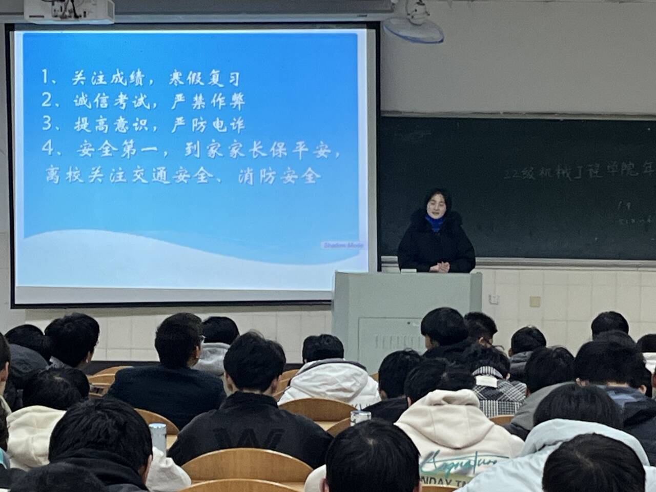 1月9日,竞彩足球 于秀山校区阶教102、103教室召开了2022级诚信考试暨寒假安全教育主题年级会,会议由2022级辅导员费白露、濮莹萍主持,2022级全体学生参加。