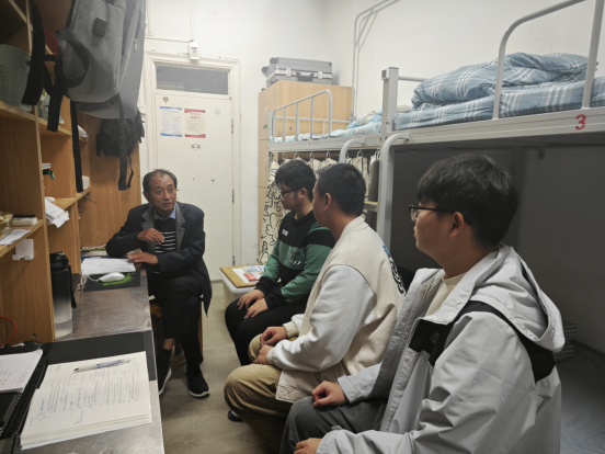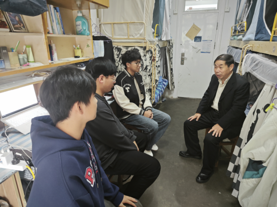 退休教师余晓流、徐向荣在新生辅导员的陪同下走进学生宿舍,与2024级新生亲切交流。